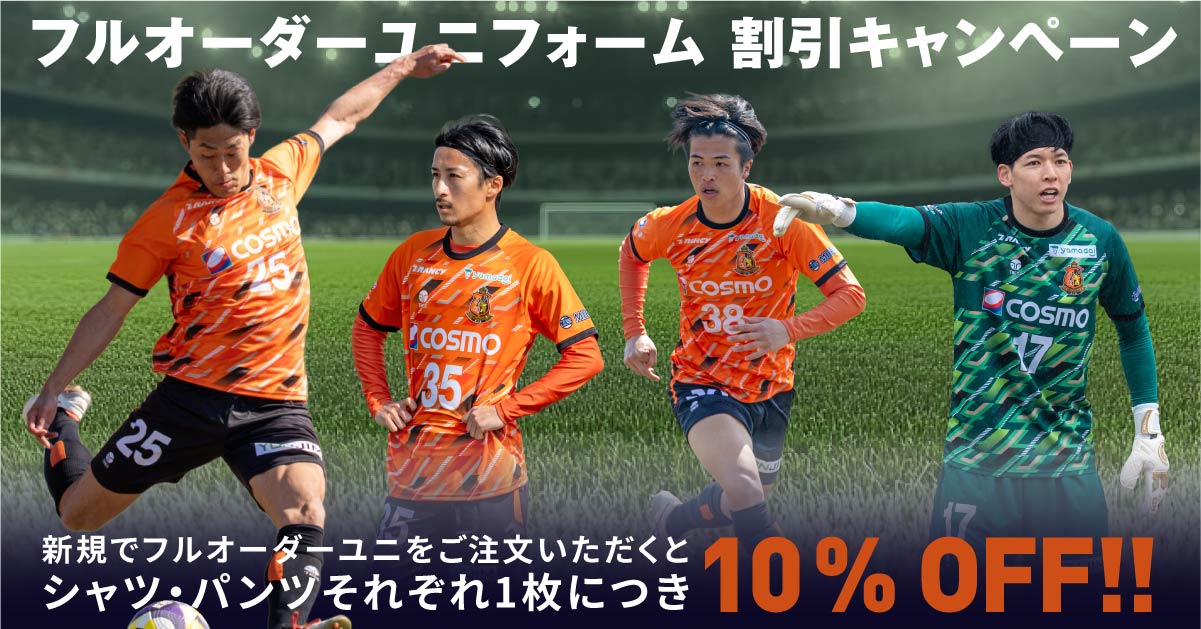 新規でフルオーダーユニフォームをご注文いただくと、シャツ・パンツそれぞれ1枚につき10%OFF!