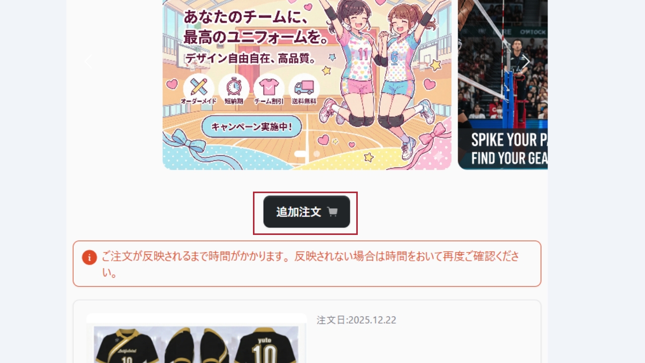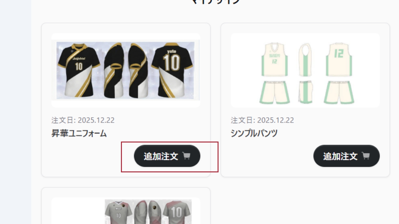 ②「マイデザイン」として過去1年分の注文が表示されます。追加注文したい商品・デザインの「追加注文」ボタンを押してください。