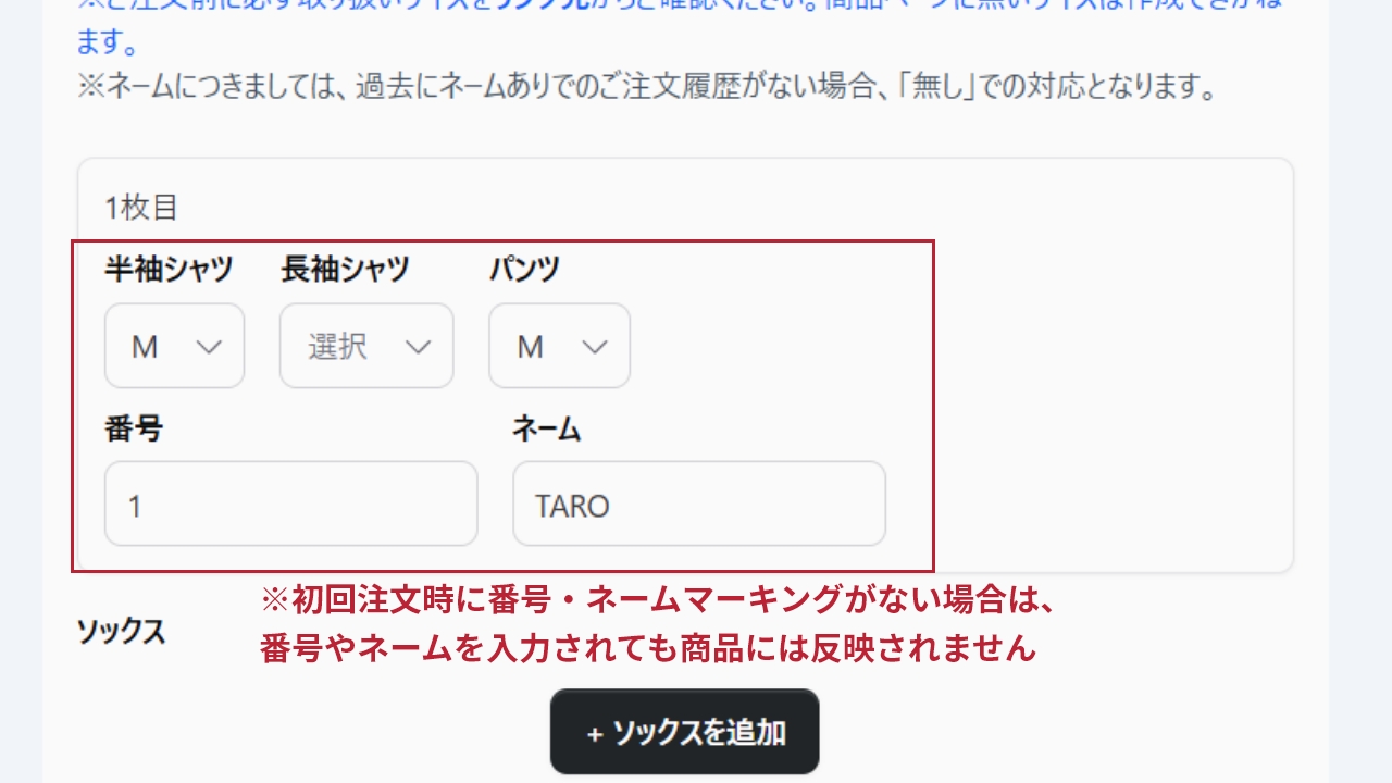 ※初回注文時に番号やネームマーキングが入っていない場合は、入っていない方が優先されます。こちらに入力されても反映されません。
