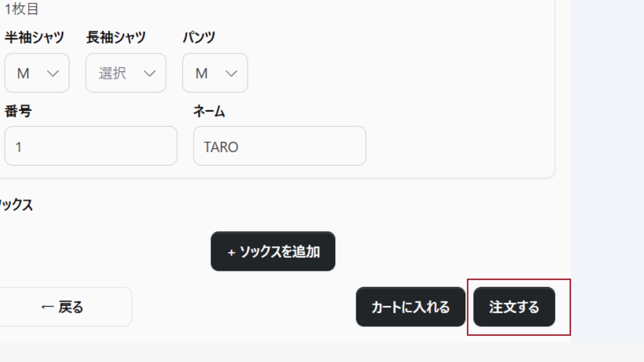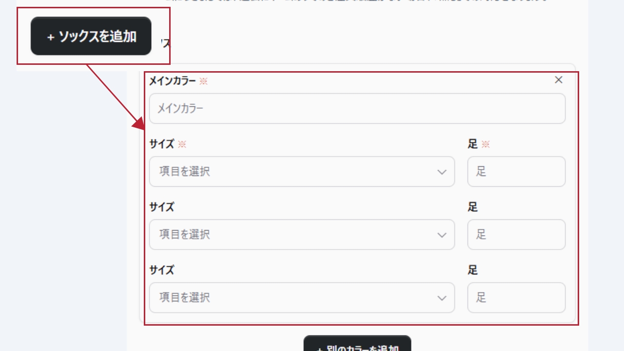 ⑤ソックスを一緒に追加注文したい場合は「ソックスを追加」を押し、表示された欄にメインカラー、サイズ、足数を入力してください。