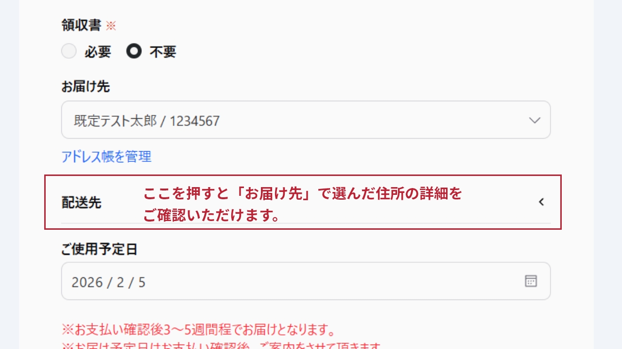 登録済みの住所は「アドレス帳を管理」またはお届け先で登録済み住所を選択し、「配送先」を押すと詳細がご確認いただけます。